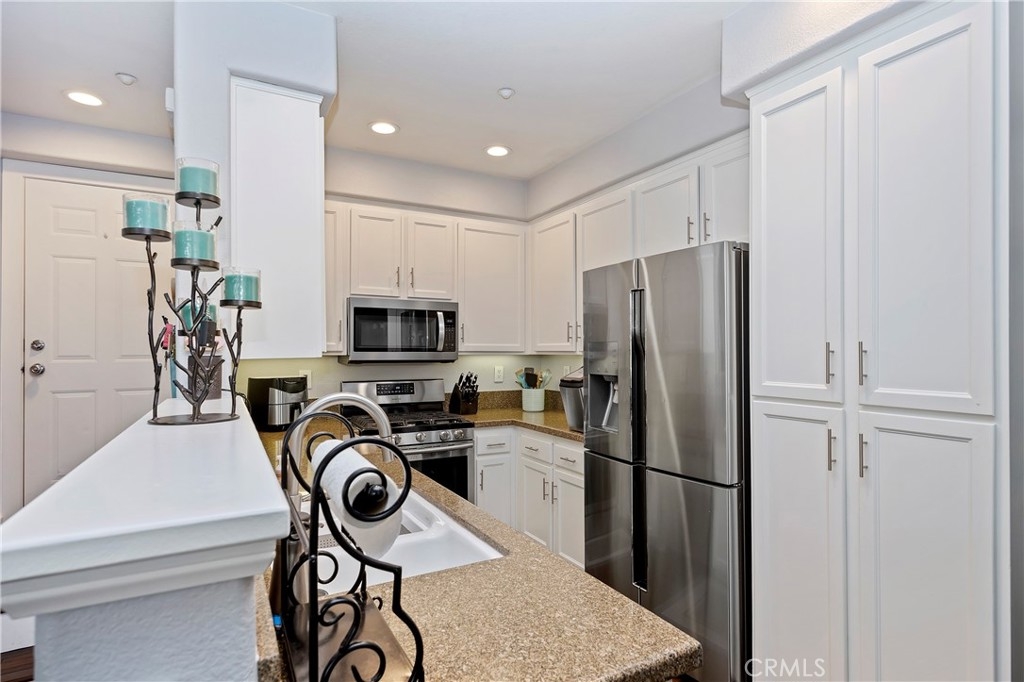 Hurry because this beautifully upgraded, 3 bedroom, 2.5 bathroom condo in won't last! You'll love the updated kitchen with granite counter tops and stainless steel appliances, bamboo wood flooring, custom baseboards, built-in entertainment center, custom fireplace place mantel with stacked-stone facia surround, door casings, neutral paint, ceiling fans and more! And, there are two single car garages with direct access into the interior and custom storage cabinets, overhead storage and a sink near the laundry hook-ups. You'll love the privacy and tranquility of the spacious rear yard which is perfect for entertaining with concrete block fencing, covered paver patio, built-in BBQ and built-in gas fire-pit and artificial turf! This well maintained, gated community features a swimming pool, spa, tot-lot and BBQ area. The community is conveniently located near shopping, restaurants, schools, parks, freeways, etc.