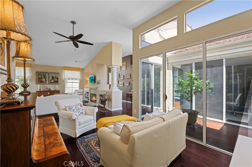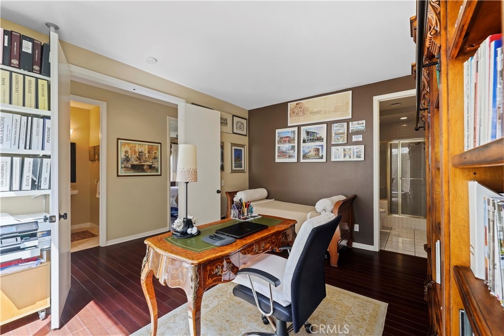 Discover your new lifestyle at this Country Club Villa home with tranquil mountain and tree views located in the guard gated community of Bear Creek. As you step into this updated retreat you'll want to linger in the open living room with chic bamboo floors, sky high ceilings, and energizing natural light. Bring the outdoors in with an atrium and patio access from the dining and family rooms. Host friends and family for al fresco dining or cozy up with your favorite tea and enjoy the sunset. Both bedrooms and the office (or optional 3rd bedroom) feature ensuite bathrooms plus a powder room for your guests. Relax and enjoy your favorite book from the custom millwork bookcase which features a retractable desk. Come envision your new beginning while it's still available!