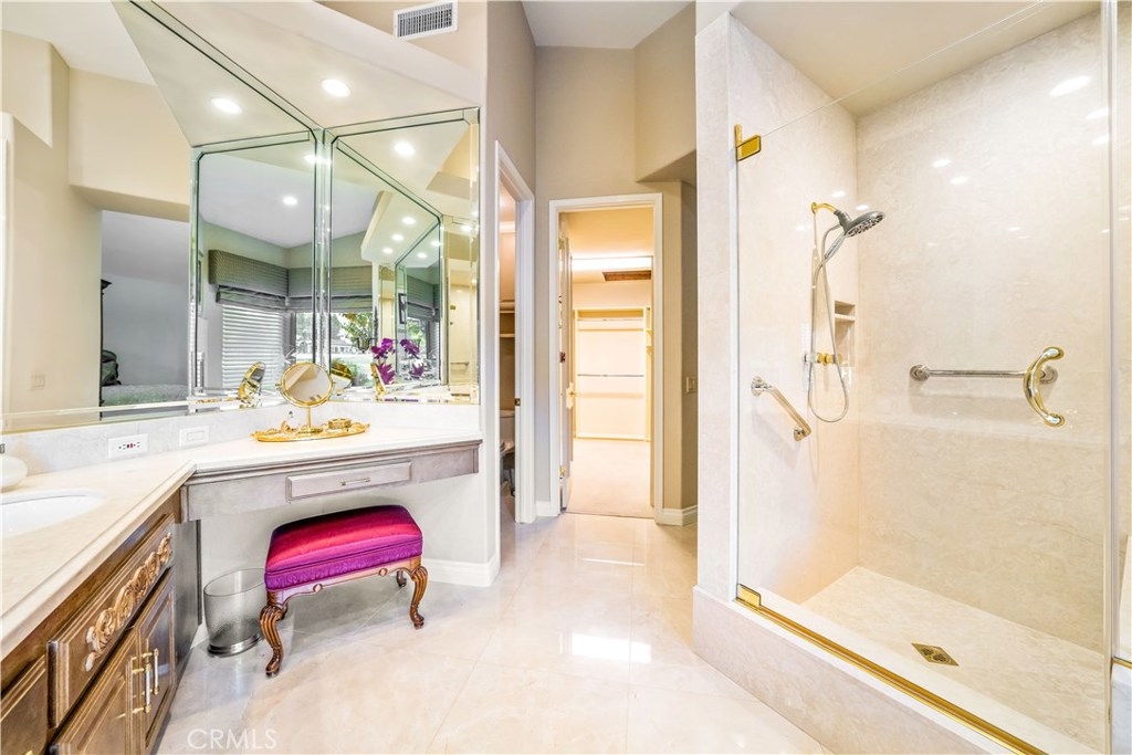 Gorgeous Fairway Estate located in the exclusive gated community of Bear Creek Golf Club. This home is total turnkey featuring 3056 sq.ft., 3 bedrooms, 3.5 baths, 2 car plus golf cart garages. Overlooking the 14th fairway, the home offers expansive views of the golf course, city lights and surrounding hills. A gated courtyard with large tiered fountain. Lovely leaded glass double door entry into the home. If you love to entertain, this is the home for you. The spacious kitchen has all SS appliances, island, walk-in pantry, granite counters & views of the golf course. Adjacent is the family room with fireplace and custom book case. The spacious living room has a fireplace, slider to the patio areas and fabulous golf course views. Dining area features a beautiful chandelier and slider to an outdoor eating area. Master suite is large featuring a fireplace, walk-in with built-ins. The master bath has spa tub, walk-in shower, dual sinks and separate vanity. Additionally, there are 2 en-suites, one is the office with 2 custom built-in desks. Some of the home’s amenities are Milgard windows, custom window coverings, outdoor sunscreens, marble & limestone flooring. Bear Creek Golf Club offers a swim/tennis/bocce ball/pickle ball/fitness club exclusive for Bear Creek residents. Bear Creek is a private guard gated community, patrolled 24/7. Enjoy resort living all year long.