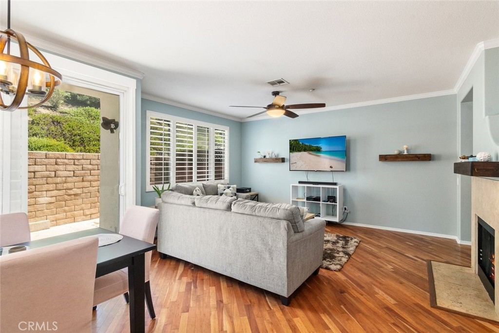 Desirable gated Montego Bay community with 3 Bedrooms, 2.5 baths and a 2 car attached garage, 1387 square feet, largest floor plan available in the community. Brazilian cherry wood floors and crown molding throughout the main floor. Plantation shutters throughout. Kitchen with granite counters, stainless steel sink, new stainless steel dishwasher and upgraded cabinets with under cabinet lighting. .Pantry with LED lighting. Dining area and living room. Half bath downstairs. Master bedroom with upgraded cabinet fixtures. Sensor switches in upstairs bathrooms. Wood shelves in living room and two bathrooms, new chandelier. Outside patio. Two car attached garage with electric car wiring, motion sensor lighting. The fabulous Montego Bay community features a resort styled pool area with shower, two spas and playground. Great location close to shopping, restaurants, health clubs.