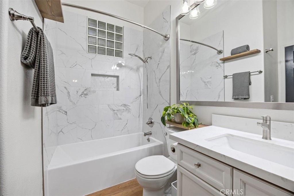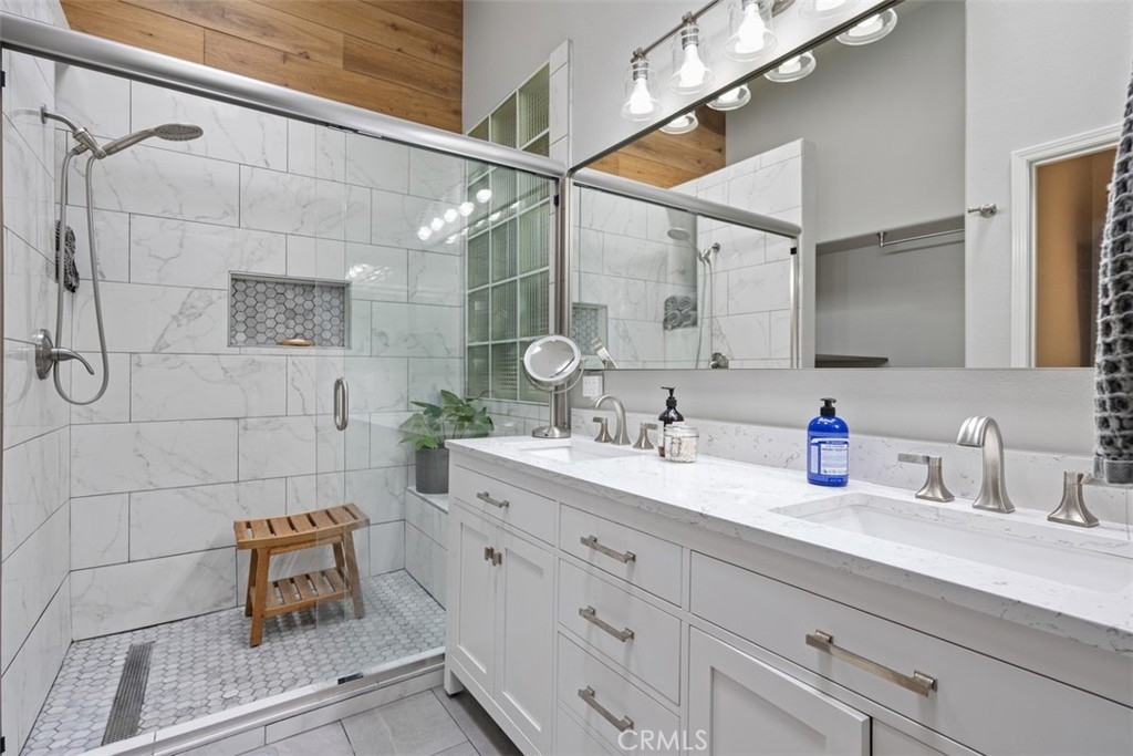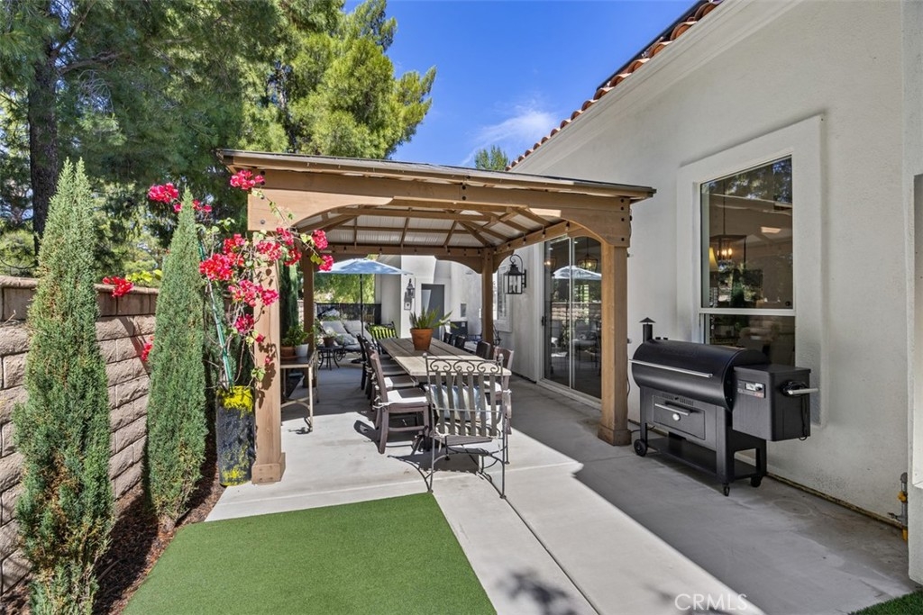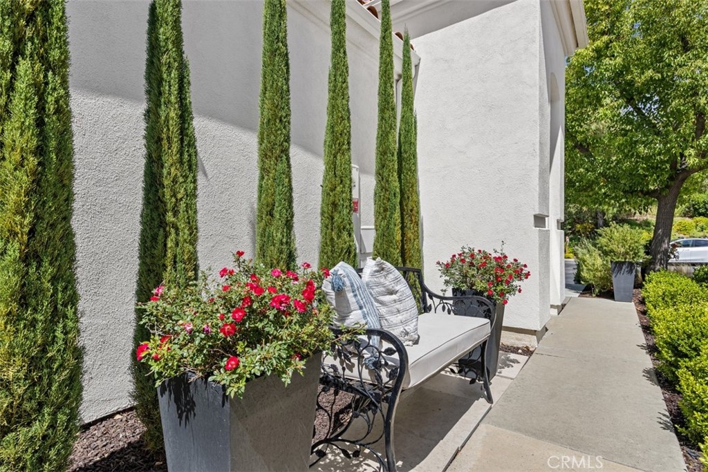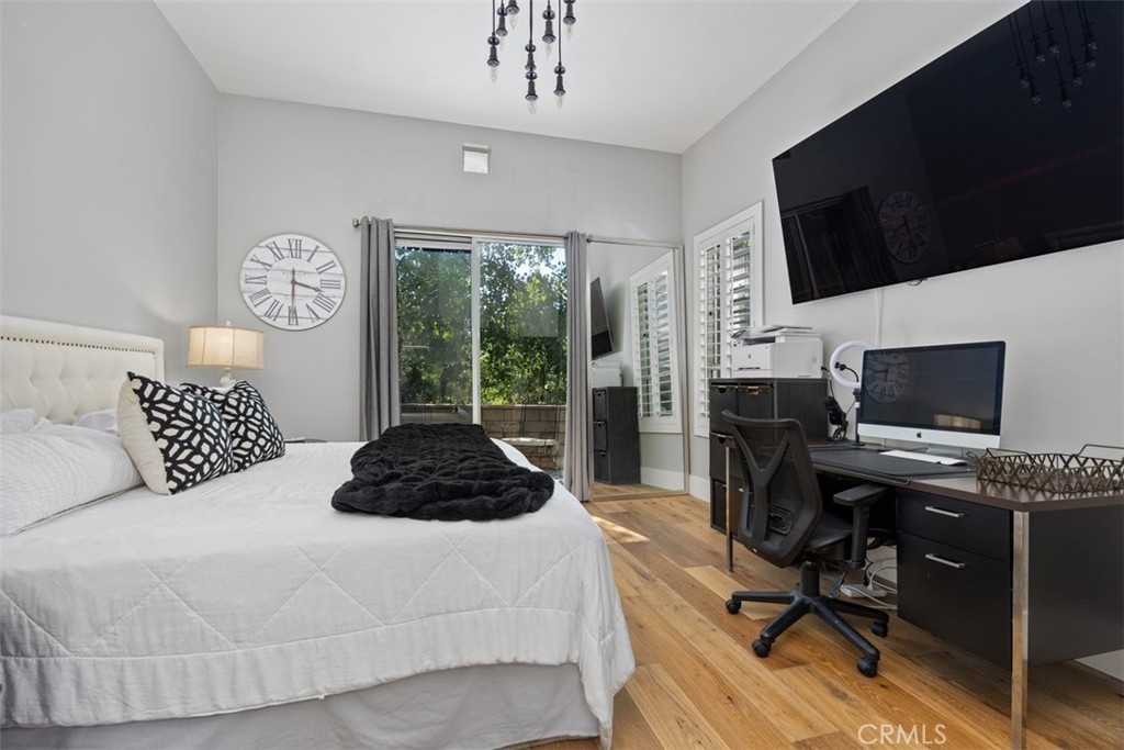 Spectacular single story unit located within the gates of the Bear Creek community. Highly upgraded and completed remodeled, light bright unit with 14 ft ceilings. Some of the upgrades include: Trane high efficiency air conditioning system, new heat pump, Rinnai tankless hot water system, whole house water purification system, Sun solar system (leased @ 159/mo), Sunburst large shutter and 240EV ready garage plug. Completely remodeled kitchen open to living/dining room, center island with seating, cabinetry to ceiling and high end stainless steel appliances. Fully remodeled bathrooms, primary includes double sinks and extra storage and closets with custom organizers. High end Pergo engineered hardwood flooring throughout. Sanctuary like private backyard with wrap around patio’s, new concrete, pergola, gas fire pit feature, putting green and sprinklers. Nothing left to do here….. just move in.