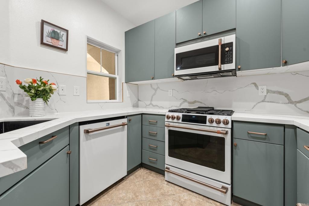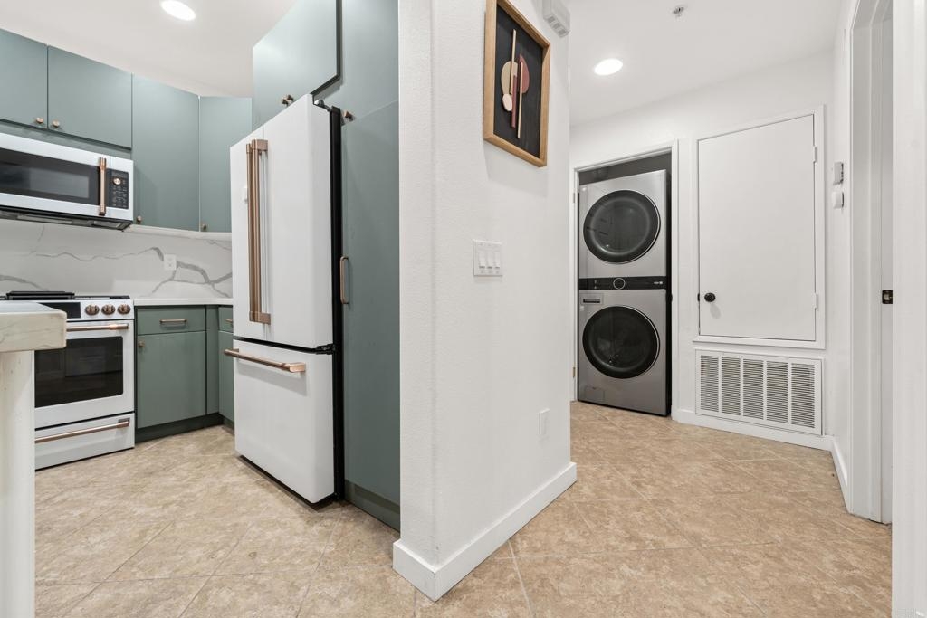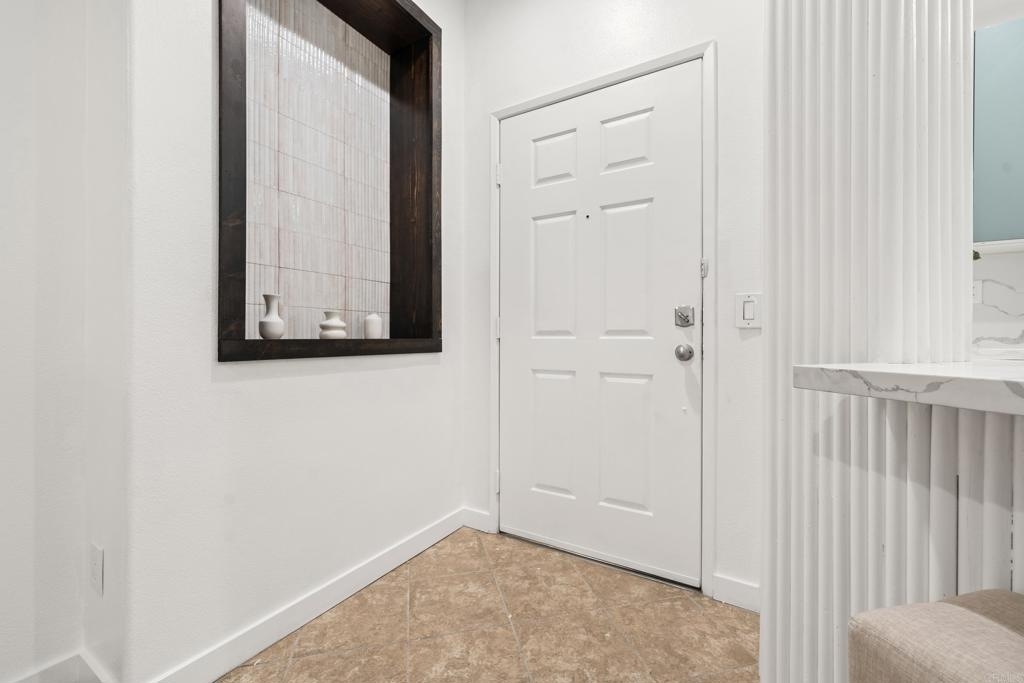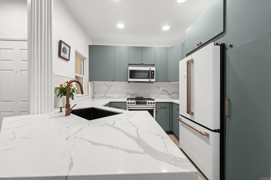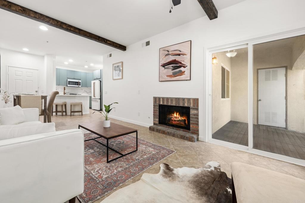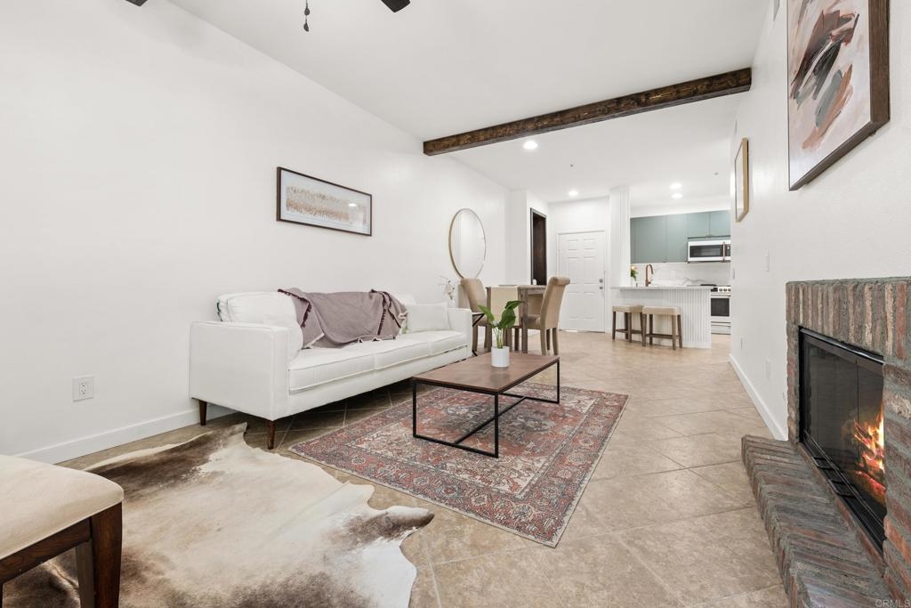 Welcome a thoughtfully upgraded 1-bedroom, 1-bath lower-level condo located in the desirable Verona community. From the moment you step inside, you’ll notice the meticulous attention to detail and custom finishes that make this home truly one-of-a-kind. The kitchen has been completely reimagined with sleek, modern cabinetry, full-height quartz backsplash, and custom fluted columns paired with a matching countertop, creating a seamless and stylish cooking space. A full suite of upgraded matte white appliances complements the kitchen’s aesthetic while offering everyday functionality. The open-concept living and dining area is enhanced by custom touches including a slatted wood accent wall with integrated window trim, a cozy modern fireplace, and rustic overhead beams that bring warmth and character to the space. A recessed wall niche adds charm and is perfect for displaying art or decorative lighting. The spacious primary bedroom features a professionally designed closet system with built-in drawers, shelving, and hanging space for optimal organization. The bathroom continues the modern, clean design with quality finishes throughout. In-unit washer and dryer for convenience. Located in a beautifully maintained gated community with pool and greenbelt areas, and just minutes from shopping, dining, and commuter access, this is your opportunity to own a turn-key home with custom designer flair.