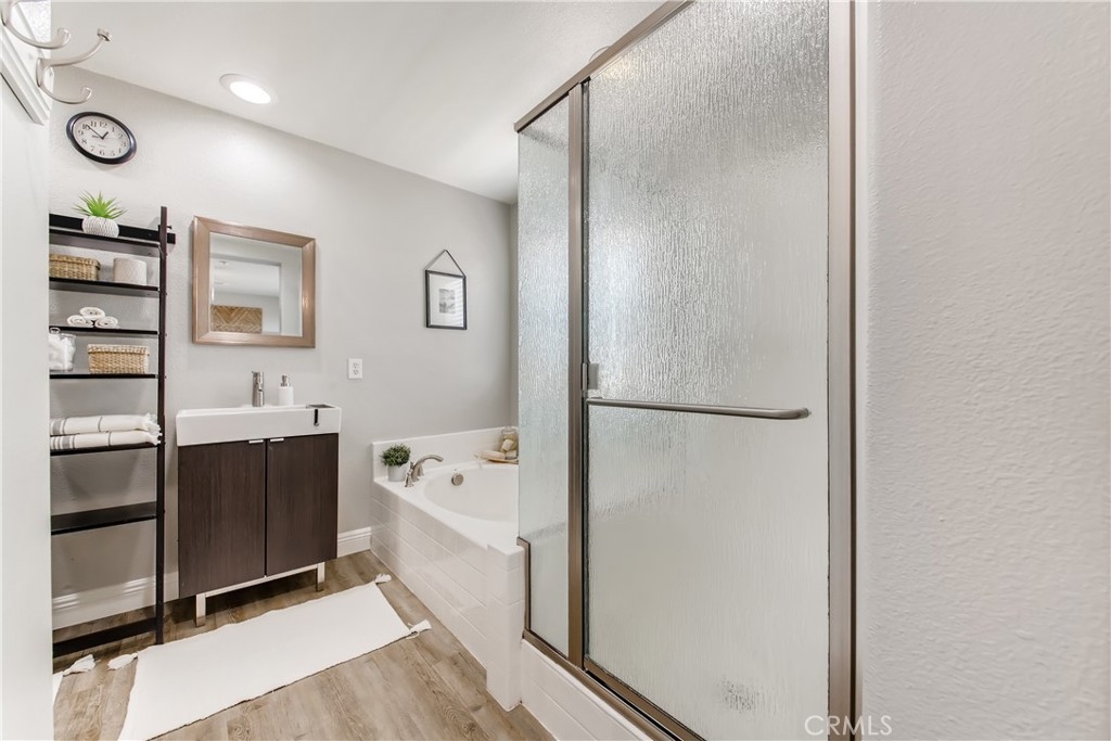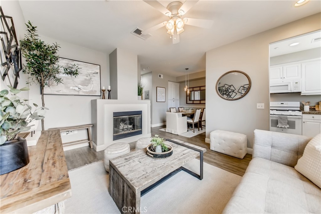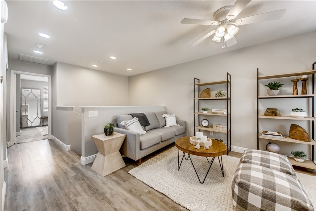 Extraordinary highly upgraded home at terrific private view location in an outstanding gated complex with community pool and spa. 2 bedrooms, 2 1/2 baths plus loft. Gorgeous wood type laminate floors throughout except the bedrooms and stairs. Custom baseboard moldings. Enter from the two front patios to the bright living room featuring a gas fireplace and ceiling fan. Separate dining room with panty. Gourmet kitchen with granite type counters, 5-burner range, microwave, dishwasher and included refrigerator. Downstairs 1/2 bath with beautiful fixtures. There is a landing half way up the staircase leading to the bedrooms and loft. The large master bedroom has stunning panoramic views and a ceiling fan. The master bath features his and her's sinks, separate tub and shower, private commode area plus a walk-in closet. In the hall leading to the second bedroom and loft you'll find a linen cabinet and the full size washer and dryer area with cabinets behind by-fold doors. Generous sized guest bedroom with adjacent loft with ceiling fan and bath that includes a tub with shower over. Attached finished 2-car garage. Great location with easy access to the 215 freeway, close to shopping as well as Kaiser and Loma Linda Hospital medical facilities.