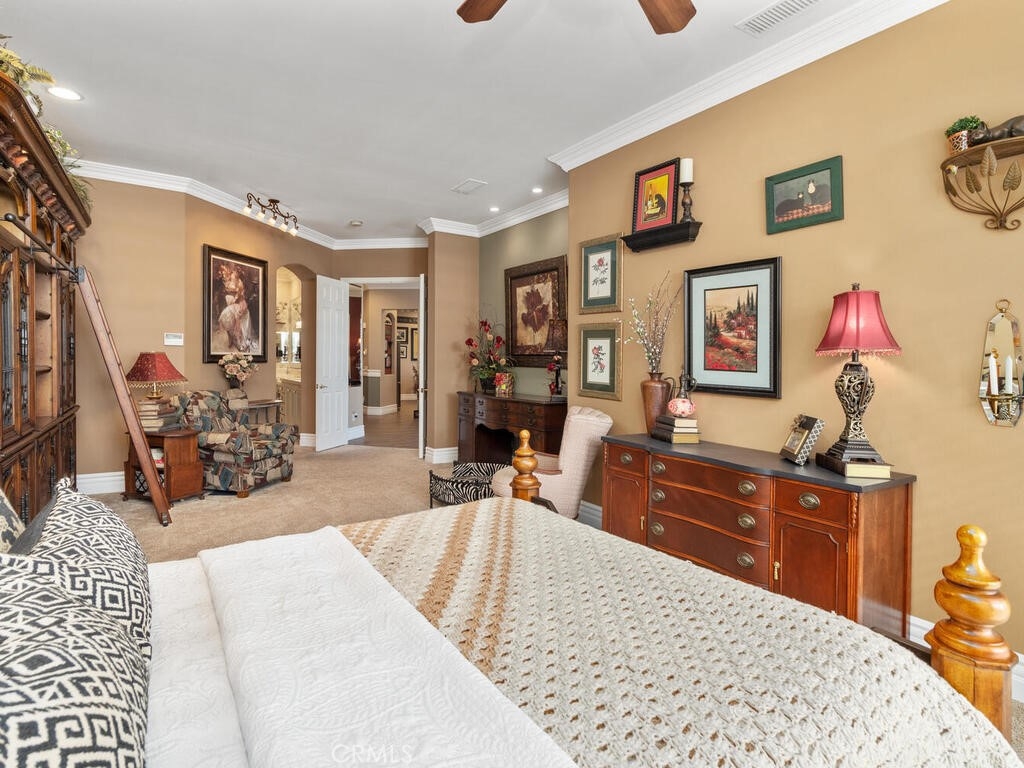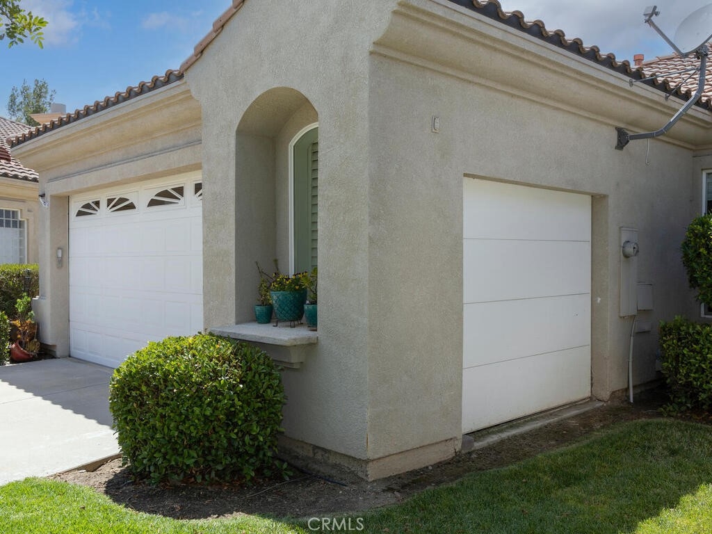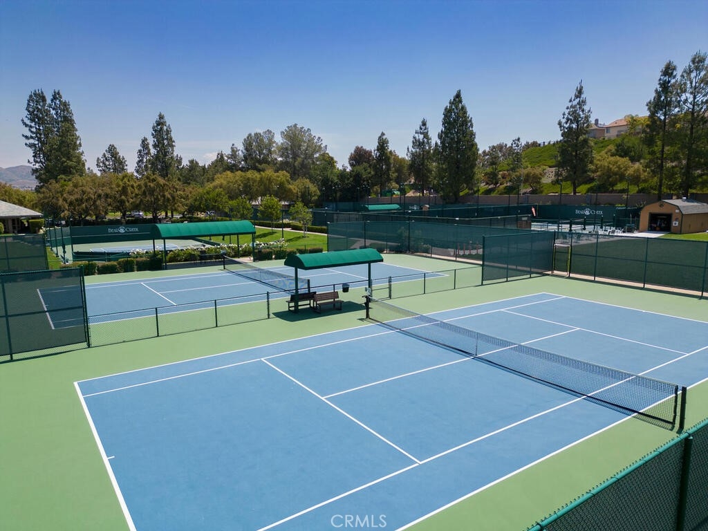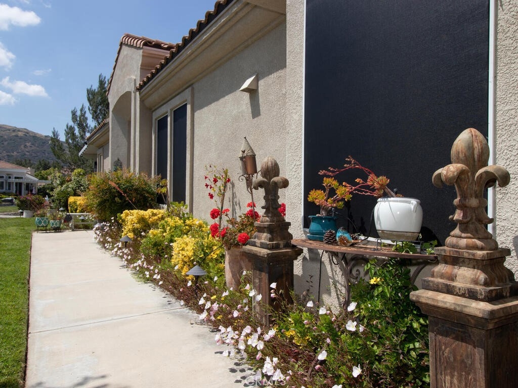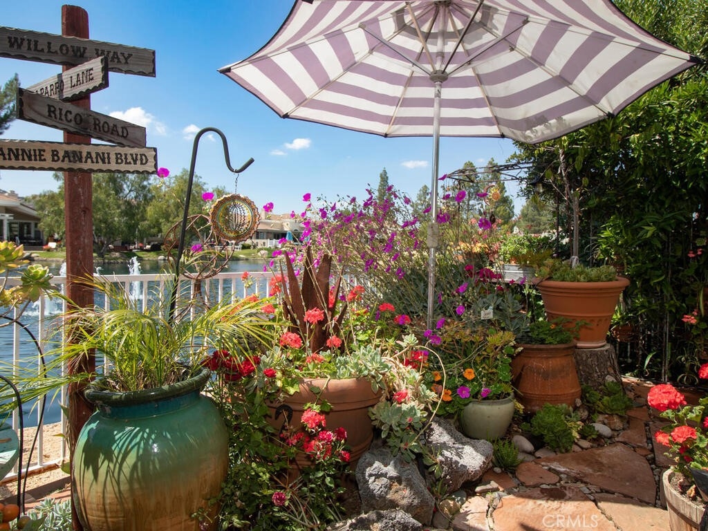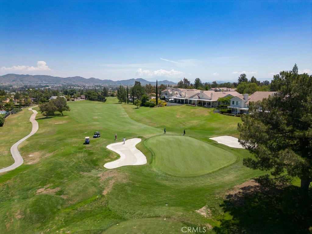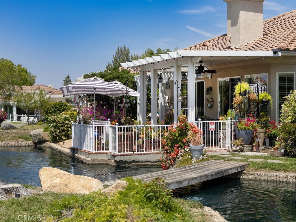 Sneak Peek of this stunning single level condo in the Country Club Villas inside the gates of Bear Creek. On the water living with mountain and sunset views. A view from nearly every room showcases this unique home. The floor plan has high ceilings, custom moldings, custom lighting with dimmers, shutters, ceiling fans and luxury plank vinyl flooring with cork underlay for comfort and quiet. The kitchen is spacious with floor to ceiling walk in pantry, pull outs in the cupboards and newer stainless appliances including beverage refrigerator. Primary suite is quite spacious with water views and patio access. Luxury walk in closet is turned out in style with custom install by "Closets by Design". Primary ensuite has dual sinks, vanity, walk in shower and garden tub. Laundry room is just perfect with sink, folding counter and cabinetry. Garage is oversize to accommodate 2 vehicles and a golf cart (2.5 car garage). The garage has epoxy coating on floor and an abundance of added storage. Home is outfitted with a hot water circulating pump and energy efficient solar screens also provide additional privacy. The patio space is truly delightful with the sounds and views of birds and water fountains. The yard is fully fenced with 2 gates and features newer alummawood patio cover. Low voltage exterior lighting in front, side and back all on timer. This unique community features pools, gym, clubhouse, social events, tennis and opportunities to join the private golf club. Association dues also include exterior water, landscape care and trash service.