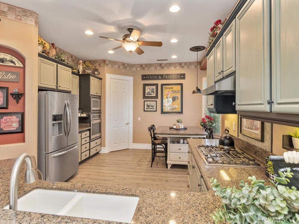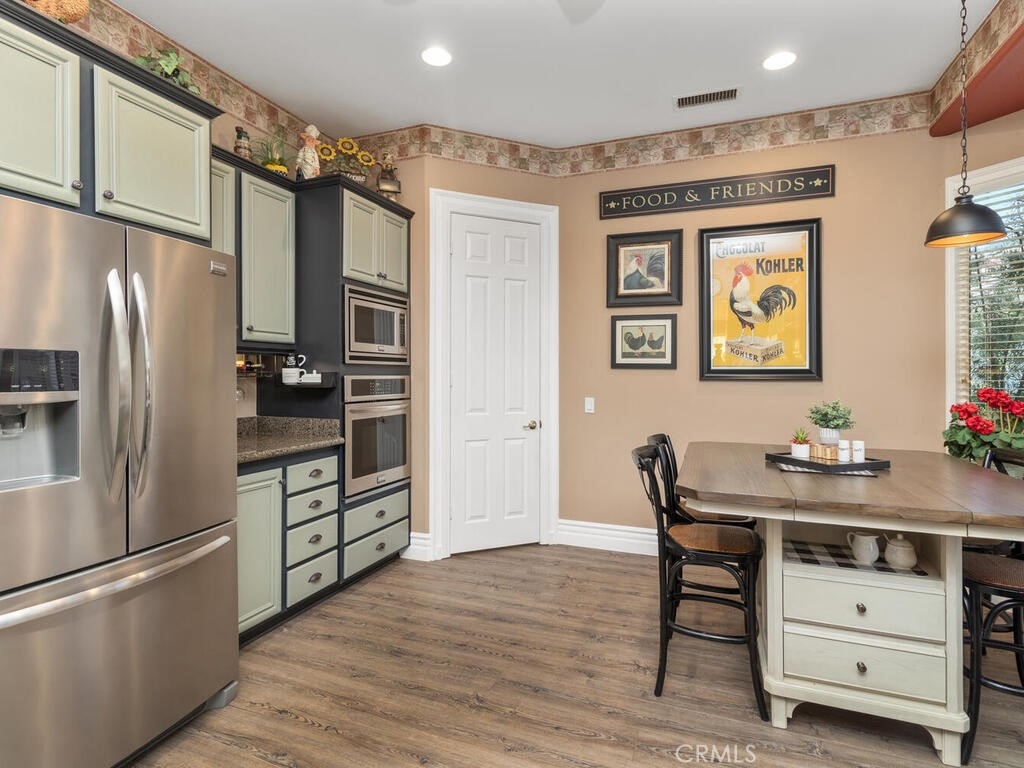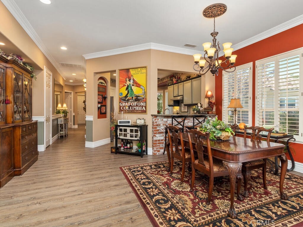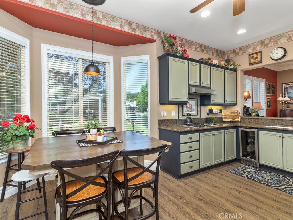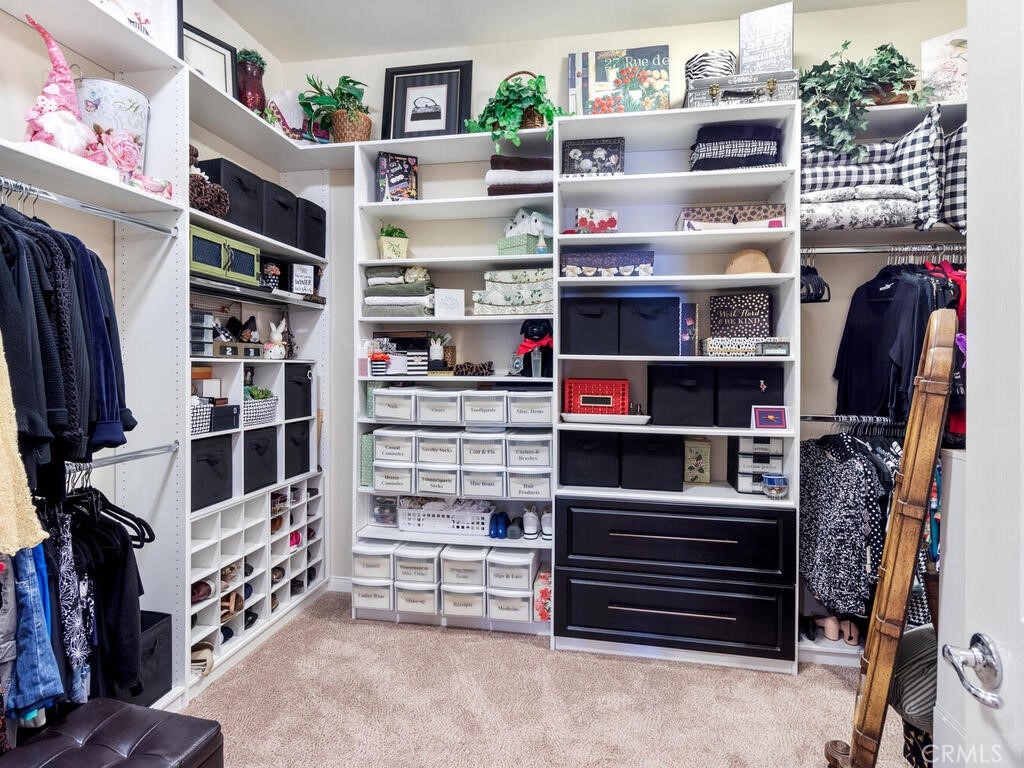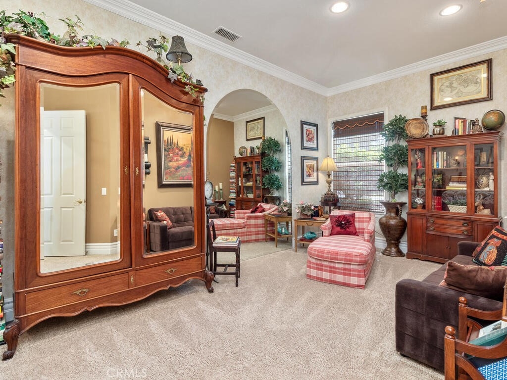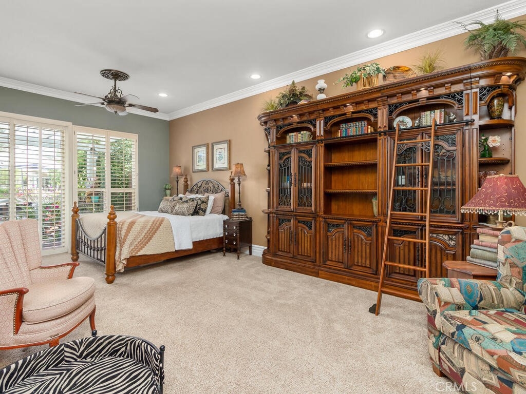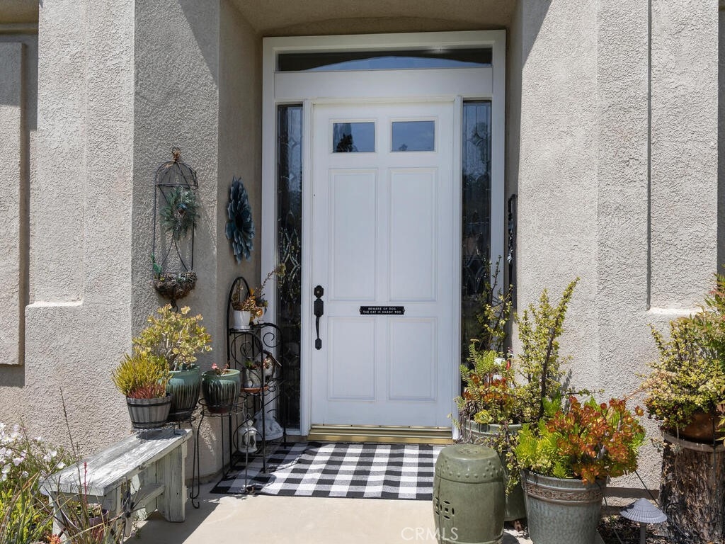 Sneak Peek of this stunning single level condo in the Country Club Villas inside the gates of Bear Creek. On the water living with mountain and sunset views. A view from nearly every room showcases this unique home. The floor plan has high ceilings, custom moldings, custom lighting with dimmers, shutters, ceiling fans and luxury plank vinyl flooring with cork underlay for comfort and quiet. The kitchen is spacious with floor to ceiling walk in pantry, pull outs in the cupboards and newer stainless appliances including beverage refrigerator. Primary suite is quite spacious with water views and patio access. Luxury walk in closet is turned out in style with custom install by "Closets by Design". Primary ensuite has dual sinks, vanity, walk in shower and garden tub. Laundry room is just perfect with sink, folding counter and cabinetry. Garage is oversize to accommodate 2 vehicles and a golf cart (2.5 car garage). The garage has epoxy coating on floor and an abundance of added storage. Home is outfitted with a hot water circulating pump and energy efficient solar screens also provide additional privacy. The patio space is truly delightful with the sounds and views of birds and water fountains. The yard is fully fenced with 2 gates and features newer alummawood patio cover. Low voltage exterior lighting in front, side and back all on timer. This unique community features pools, gym, clubhouse, social events, tennis and opportunities to join the private golf club. Association dues also include exterior water, landscape care and trash service.
