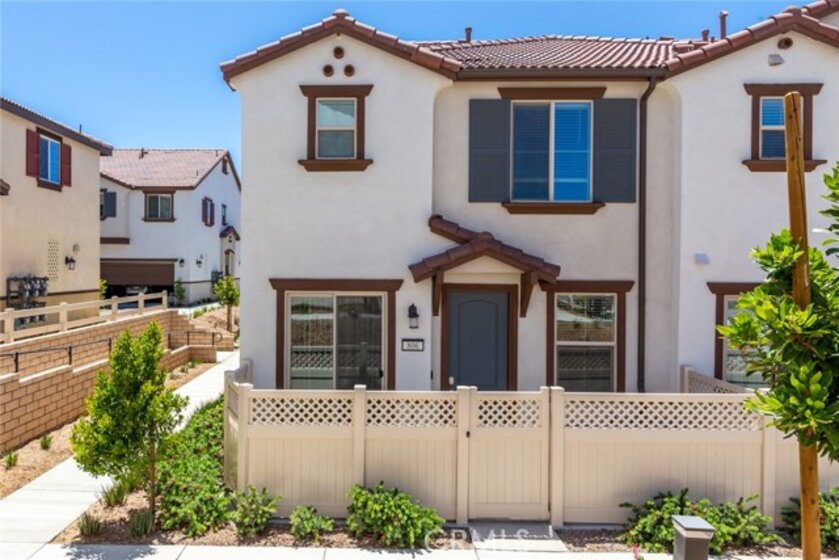 Amazing opportunity to own a like new Condo in the newer community of Solera by Lennar. 3 Bedrooms, 2.5 Baths End Unit with Extra Privacy. This newly built home features builder installed whole house fan, fire sprinklers, low maintenance fencing around courtyard and solar panel system. The courtyard is the perfect spot to bbq and relax. Your front door entry will welcome you into the open concept living area with upgraded vinyl flooring. The kitchen features granite countertops and stainless steel appliances. The kitchen opens to the living room. Extra large powder room on the first floor. Upstairs features all bedrooms. The primary bedroom is large and inviting. The primary bathroom has dual sinks, walk in shower and closet. 2 Car attached garage,. Additional upgrades include a tankless water heater and smart home features such as the smart thermostat and wireless access point. The Solera community has a beautiful pool and clubhouse for the new homeowners' enjoyment. No need to imagine, come see all this home has to offer! Located near schools, shops, and both the 215 and 15 freeways for your convenience.