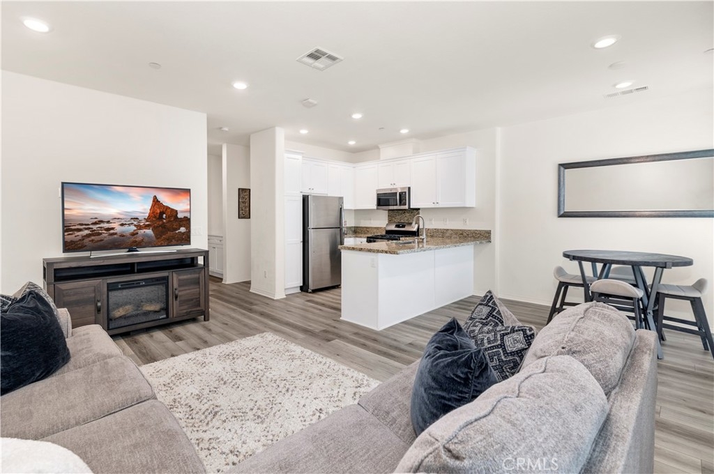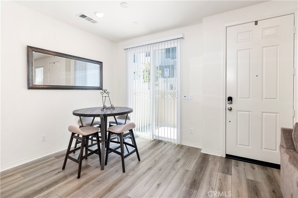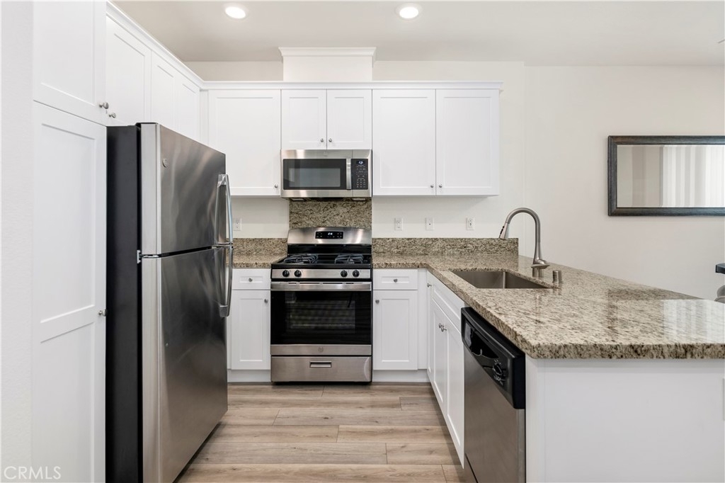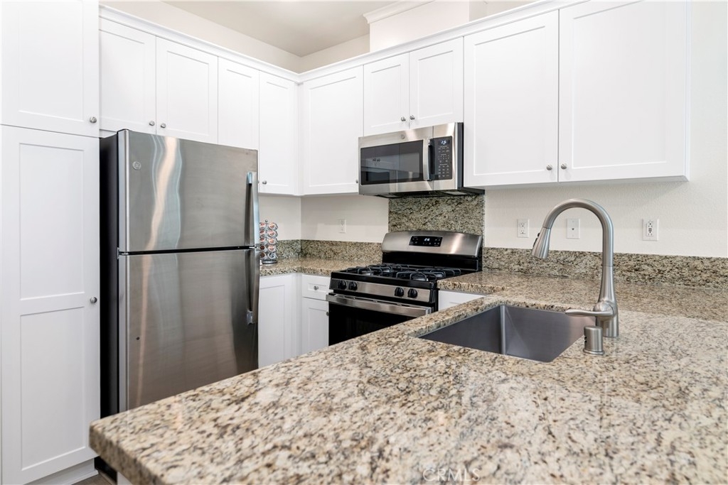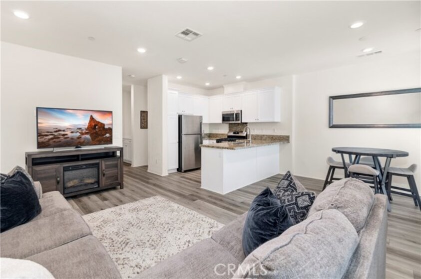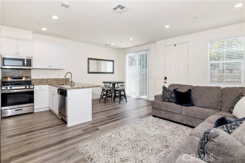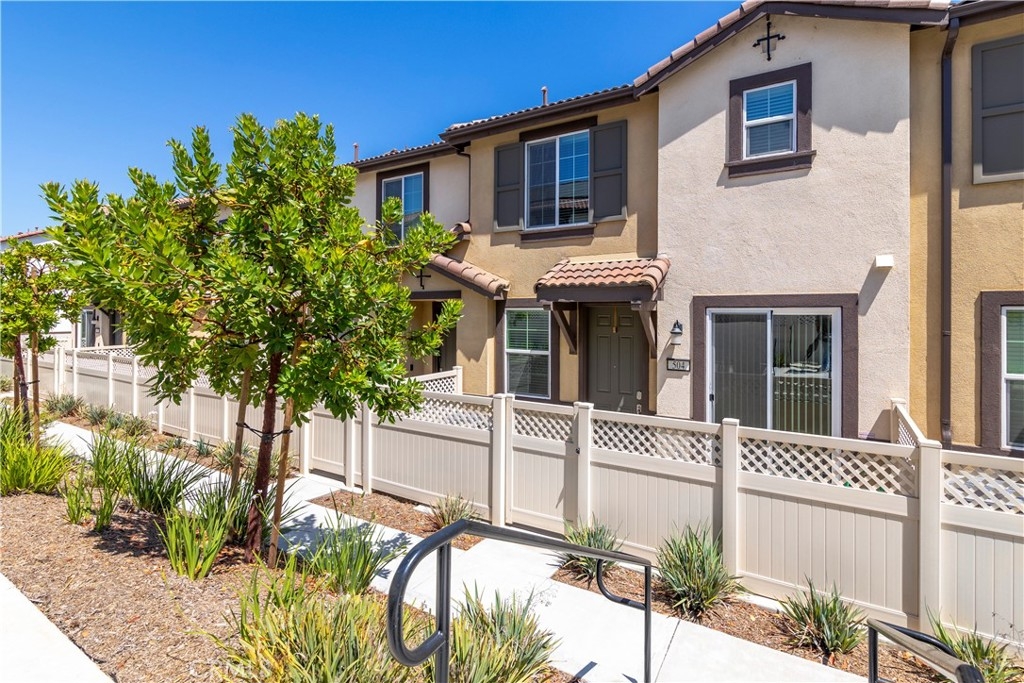 Stunning turnkey 1,466 sq ft condo at Solera by Lennar! This upgraded unit is move-in ready and bursting with contemporary functional style. Plenty of natural light opens up the downstairs great room, highlighting gorgeous new floors that flow throughout the first level. The sleek kitchen features granite countertops, crisp white cabinets, and stainless steel appliances, including a farmhouse sink, creating a space that's both, modern and practical. The attached two-car garage offers safety, avoiding street parking hassles. The first floor also offers a private front terrace with sliding doors where your family can spend relaxing afternoons. A large closet under the stairs gives plenty of storage space. Head upstairs to the master bedroom, which features a generously sized walk-in closet that maximizes the living area, 2 additional bedrooms plus one full bathroom, and a laundry room also found upstairs. This recently built and well-kept condo has features designed for contemporary living, including a tankless water heater, pre-wired internet throughout the house for seamless connectivity, and a keyless entry door lock for added security and convenience. Plus, the guest room boasts a designer's wall panel, offering a personalized style to your guest's stay. The Solera community house is just steps away from the unit. The gated clubhouse amenities include a sparkling pool, a soothing spa, a cooking, and a BBQ area with plenty of seating space – ideal for fun afternoons ideal to entertain family and friends. The community center offers even more opportunities to connect with your neighbors. This condo is equipped with solar panels, offering energy efficiency. This perfectly situated condo offers the best of both worlds – a modern lifestyle and a vibrant community. You'll be close to schools, freeways, restaurants, shopping centers, and family entertainment.