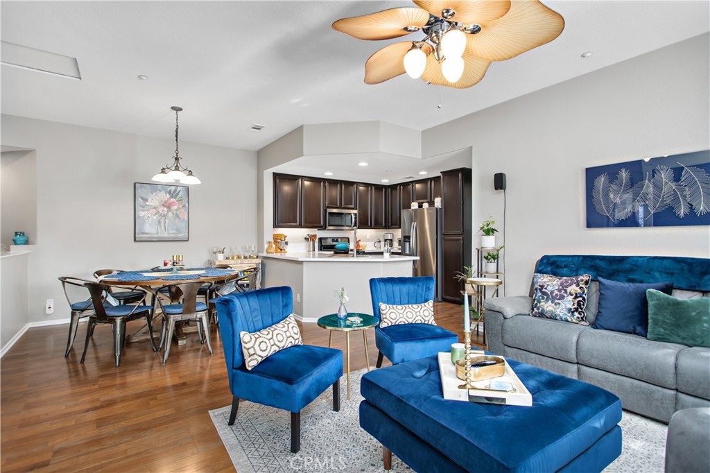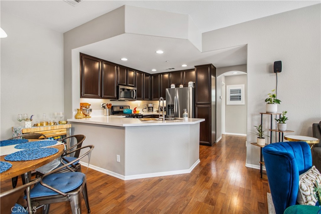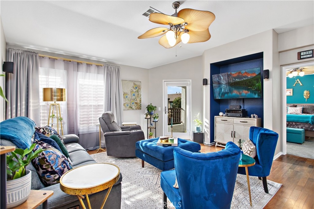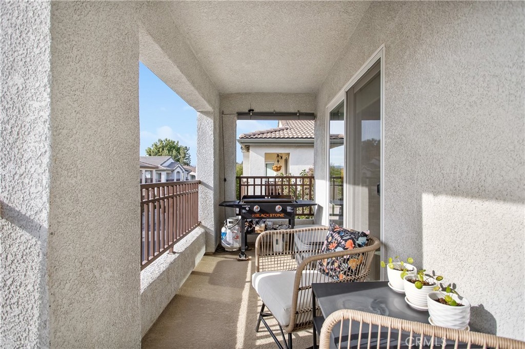 Welcome home to 25190 Crest Haven #2 located in the gated community of Meadowlane in Murrieta! This pristine condo features wood laminate flooring, ultra plush carpet, designer paint, plantation shutters and rolling shades throughout and a spacious interior. Upon entering the home, you will find access to the one car garage and stairs to the main living area. The heart of the home is open and features tons of beautiful, natural light. The dining area comfortably fits a large round table to host dinner parties or game nights! The living room is fit with a gorgeous window that looks out to the community and a glass door looking onto the balcony where you can catch a breathtaking sunset! The kitchen is the real star of the show! With stunning white quartz countertops, dark wood cabinets, stainless steel appliances, a deep farmhouse sink, and recessed lighting, this kitchen will wow your guests! A huge pro to this home is that each bedroom is on opposite sides of the home giving you the ultimate privacy. The master suite features plantation shutters, access to the balcony, dual sinks in an upgraded vanity with quartz countertops, and a shower/tub combo. On the other side of the home, you will find a well-sized guest bedroom with plantation shutters, and a guest bathroom just across the hall, fit with a shower/tub combo and an upgraded vanity with quartz countertops as well. This community offers a ton to residents from a tot lot perfect for kids to play, a resort style pool and spa, and an outdoor cooking area! Centrally located near shopping, schools, dining, Old Town Murrieta, and freeway access, this home is in the ideal location. Low HOA, low property taxes, an attached garage, an extra assigned parking space, and a security gate are just some of the reasons that make this home so desirable! Don't miss your chance to call this wonderful home yours! Schedule a private showing today!