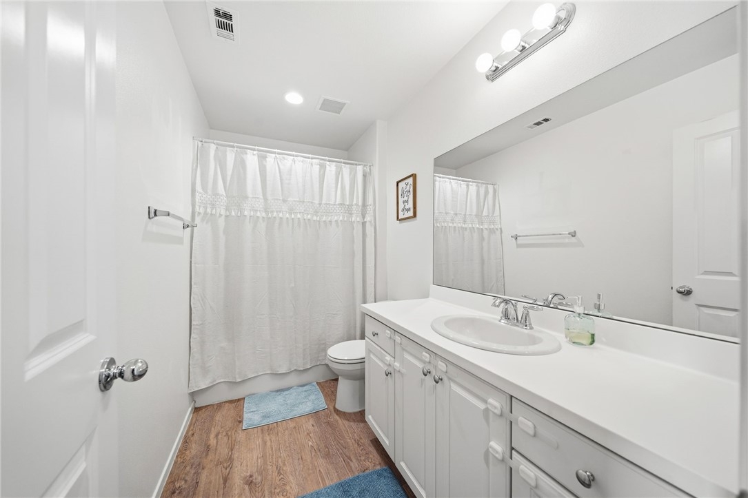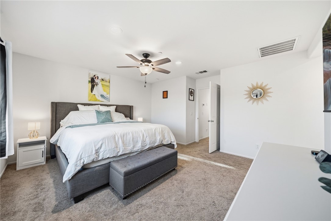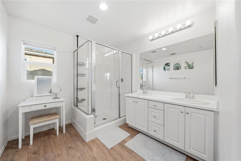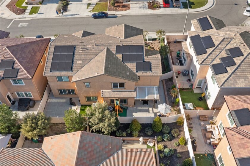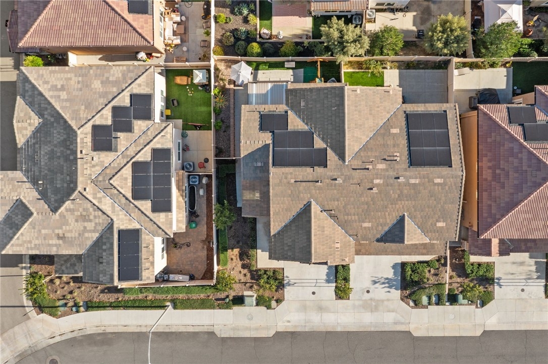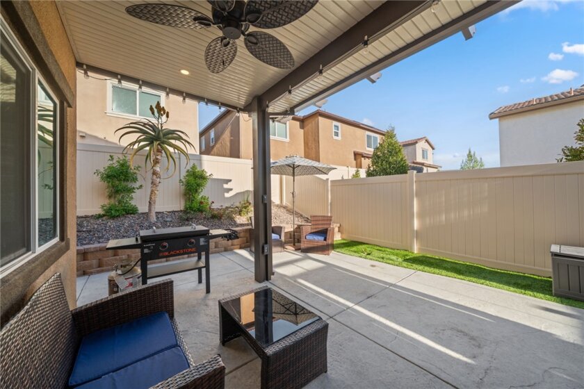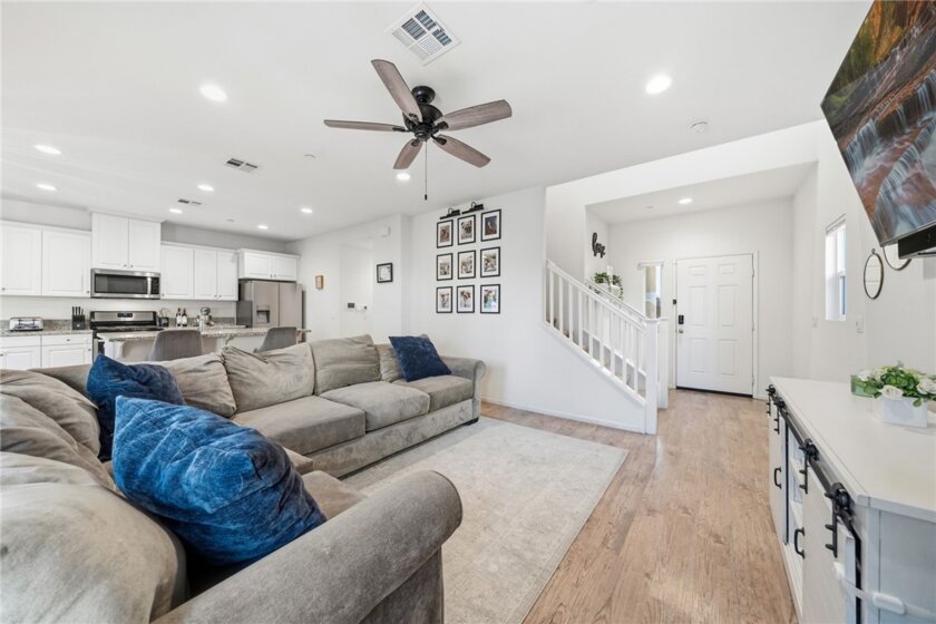 Winterberry is a beautiful end unit two story condo that truly lives and feels like a single family home. Showcasing approximately 1,728 sqft with three bedrooms, a spacious loft, two and a half bathrooms, a two car direct access garage with a rare full driveway plus a front yard and back yard. Other main property highlights include a tankless water heater, fully owned solar, a whole house fan, central AC, dual pane windows throughout plus a whole house water softener system. As soon as you walk into your new home, you will notice how light and bright the entire floorplan is. The entire downstairs portion of the home features laminate flooring. The living room is centrally located next to the chef's kitchen which has plenty of cabinetry for storage, stainless steel appliances, a stunning large island plus additional seating space in the adjacent dining room. There's also a downstairs half bath for guests as well as closet space and a pantry for storage. Upstairs a hallway connects all bedrooms as well as the large loft. The spacious primary bedroom has recessed lights, a ceiling fan and an ensuite primary bathroom with a walk in closet, dual sinks for the vanity and a walk in shower. The two guest bedrooms feature ceiling fans as well as sliding door closets. The upstairs hallway bathroom has a shower tub combo. Also upstairs you'll find a laundry room as well as a closet for storage. The wraparound backyard has plenty of space to entertain with a patio cover installed with an outdoor fan for those summer nights. There is also a garden bed on the side of the house for those who enjoy to garden. Located just down the street is the Santa Rosa Highlands community pool, kid's splash pool, playground, outdoor bbq area as well as a community clubhouse that is used to host events. Centrally located in Murrieta with nearby parks, shopping centers, Old Town Murrieta and great schools.