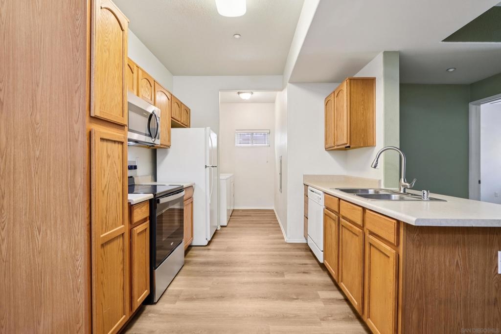 Tucked away in a private, peaceful corner of the community, this inviting ground-level condo offers comfort, convenience, and a thoughtfully designed layout. A spacious patio creates the perfect outdoor retreat—ideal for morning coffee, relaxing evenings, or casual entertaining. Inside, the open-concept living space is centered around a cozy fireplace, with the living room flowing seamlessly into the dining area and kitchen, creating an airy and welcoming atmosphere. The smart split-bedroom floor plan places a bedroom and full bathroom on each side of the home, offering privacy for residents or guests—both bedrooms featuring generous walk-in closets. Stylish vinyl plank flooring runs throughout the home, adding a modern touch while enhancing durability and ease of maintenance. The kitchen comes well-equipped with a microwave, oven, dishwasher, and refrigerator, while the included washer and dryer add everyday convenience. A rare bonus feature is the extra-large walk-in storage closet just off the living room—perfect for keeping everything organized and out of sight. The home also includes the convenience of a detached garage. Set within a gated community, residents enjoy resort-style amenities including a pool, spa, recreation court, and rentable clubhouse. HOA dues conveniently cover water and trash. With its desirable location and thoughtful features, this Murrieta home presents an excellent opportunity to enjoy comfortable Southern California living.